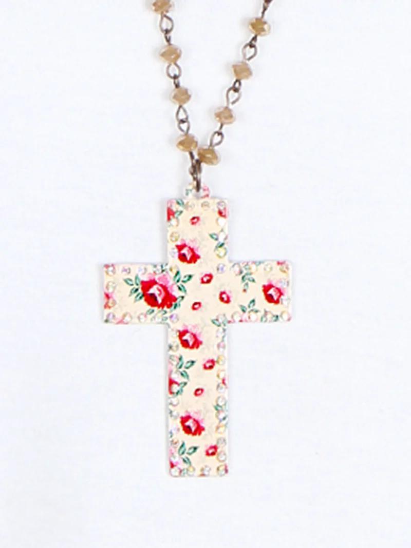 BEIGE FLORAL CROSS NECKLACE WITH AB CRYSTALS