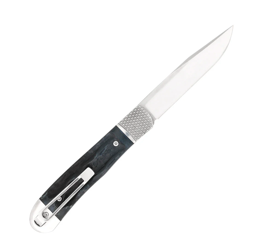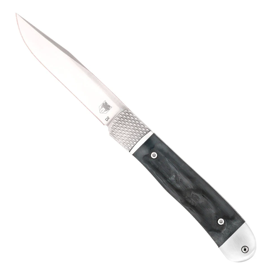 Introducing our new Patent Pending CobraTec Trapper Hidden Release automatic. The handle is comprised of various textured handles with steel bolsters and comes with a drop point D2 steel blade. Push the bolster up to deploy the blade and push the bolster up again to release the lock. The Trapper has been around for many years and CobraTec is excited to add a bit of modern to this knife by making a hidden release auto.