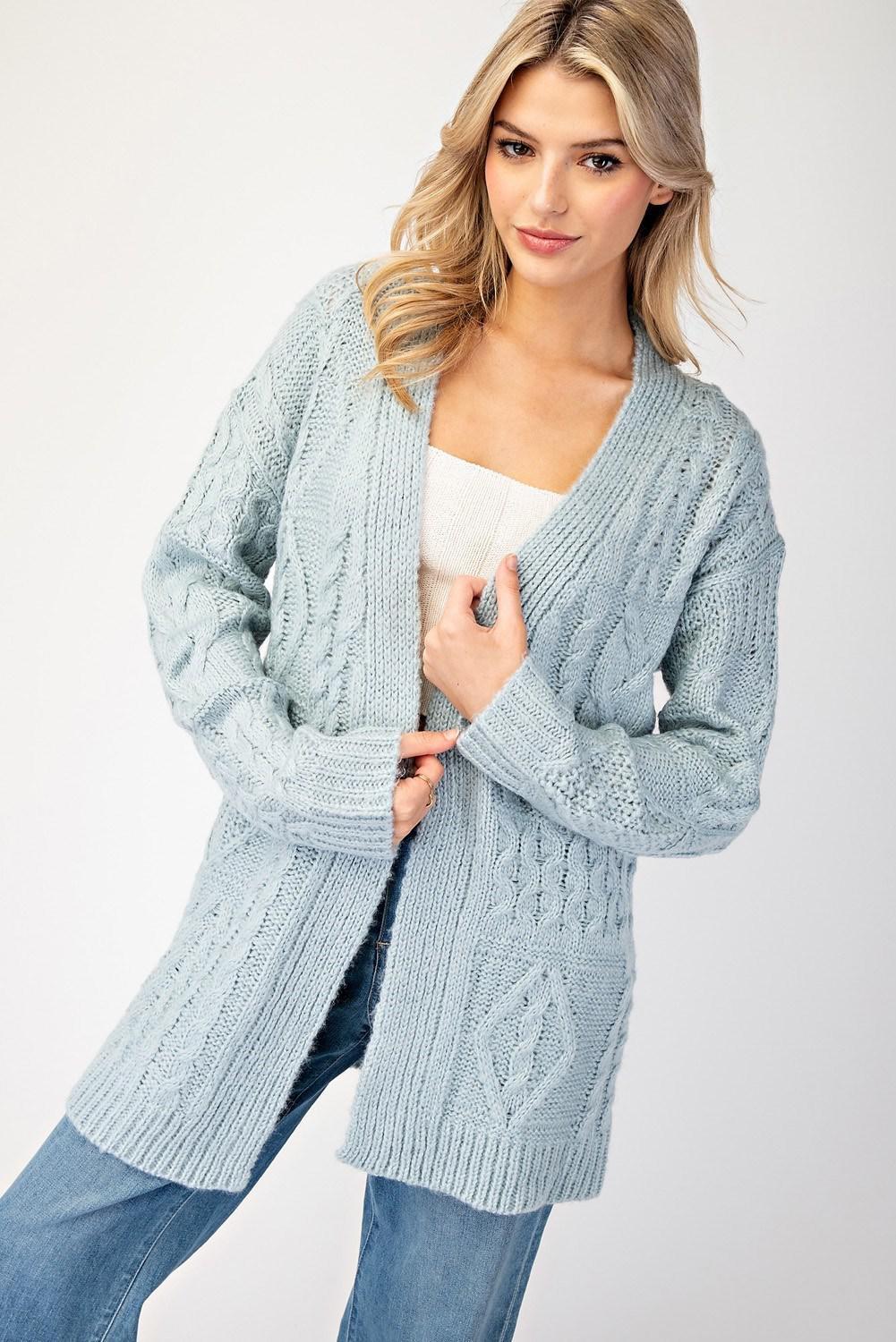 Long sleeve cardigan featuring an open front, a tunic length style, a mix crochet pattern going throughout and ribbed cuffs.