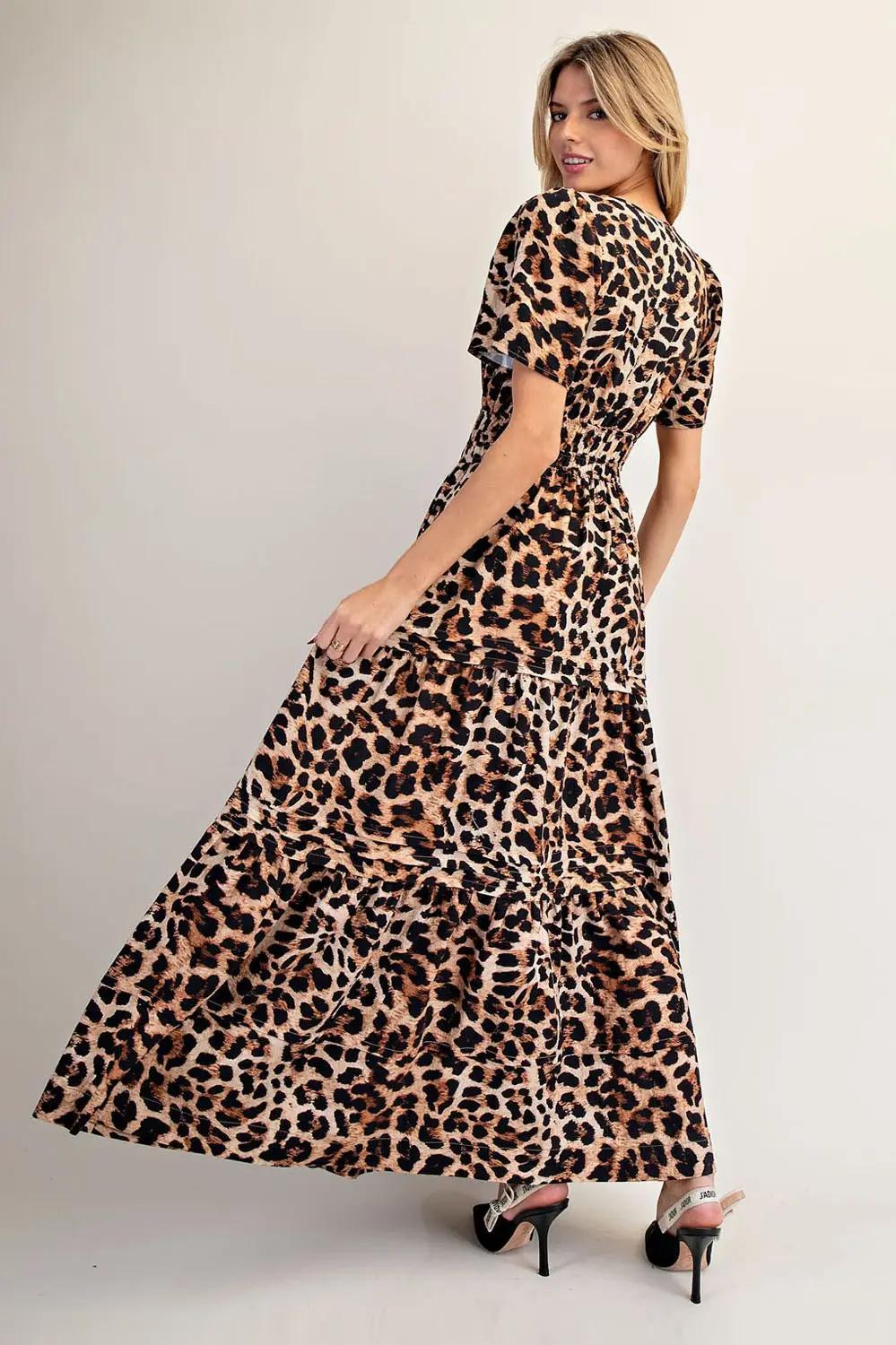 This statement making maxi dress features an allover leopard print on a crinkled woven fabric, designed with short sleeves, a notched neckline, an elasticated waistband, side pockets, and tiered seaming for a bold yet easygoing silhouette.
