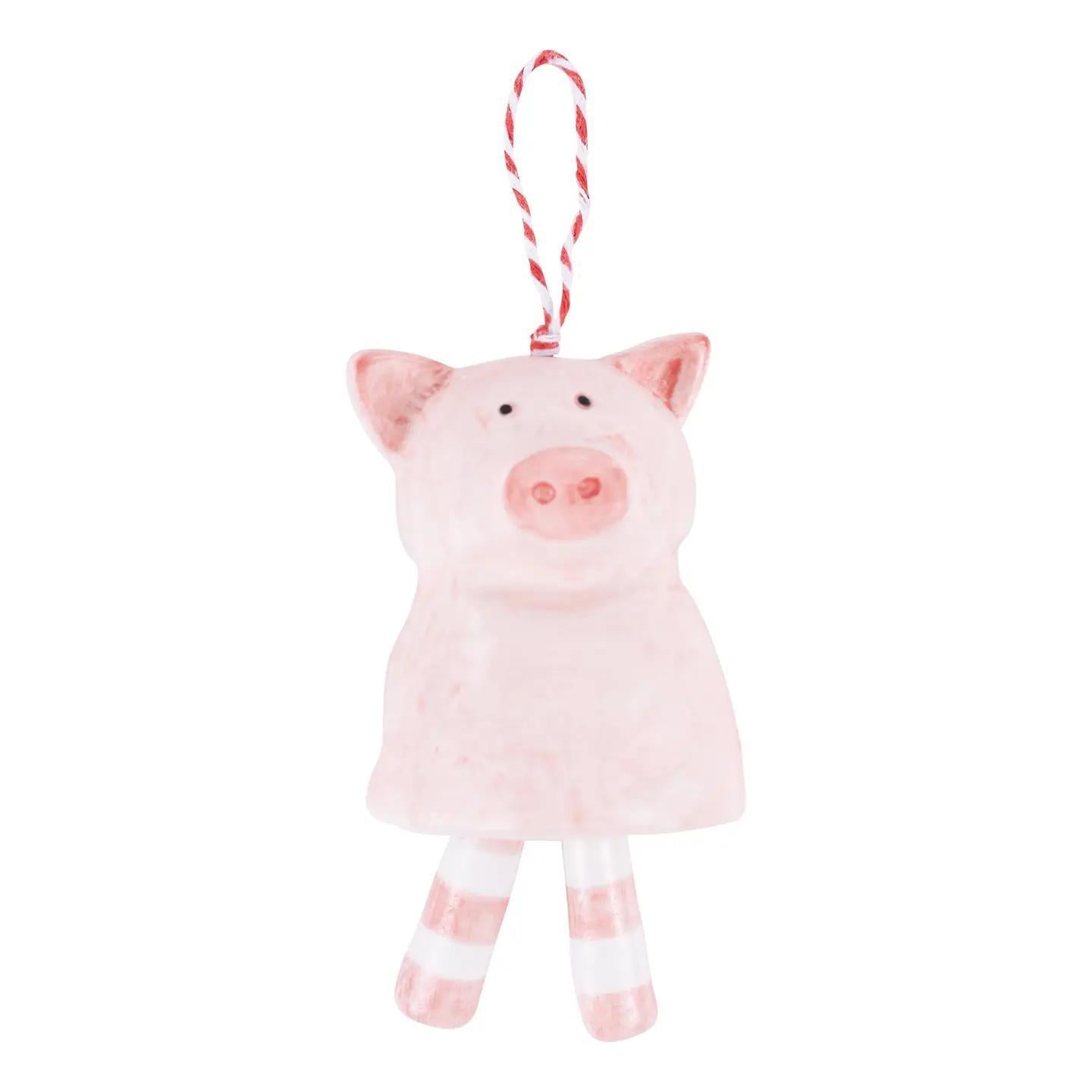 Bring a touch of farm life to your holiday decor with our hand-painted ceramic pig ornament. Featuring dangling legs, this bell-inspired ornament is a unique addition to any Christmas tree. It can also be used as a year-round accent to your farmhouse and pink pig loving home or office! The charming design twinkles delicately with movement and is sure to bring smiles to all nearby!