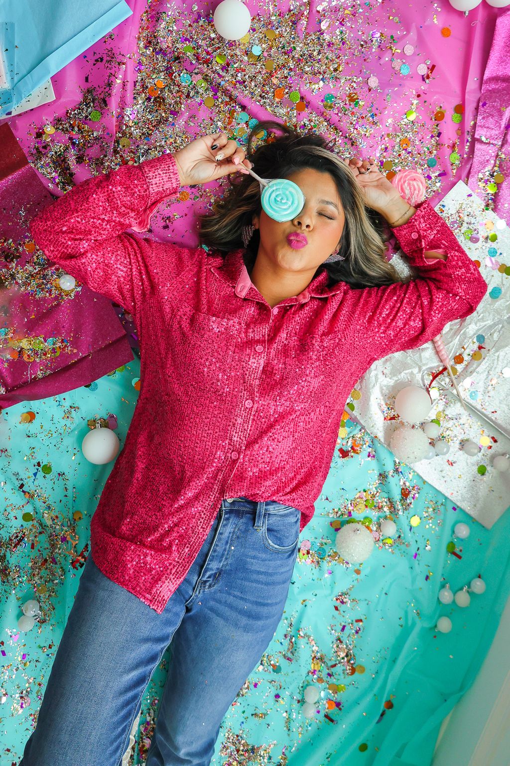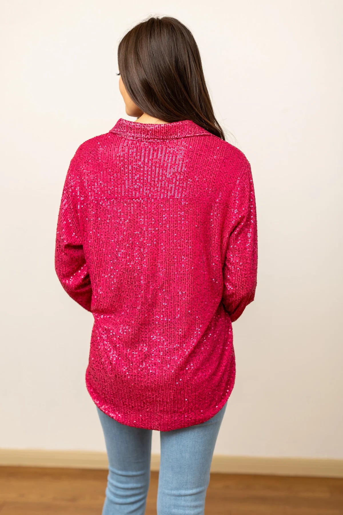 KATHRYN CLASSIC BUTTON-UP, HOT PINK SEQUIN