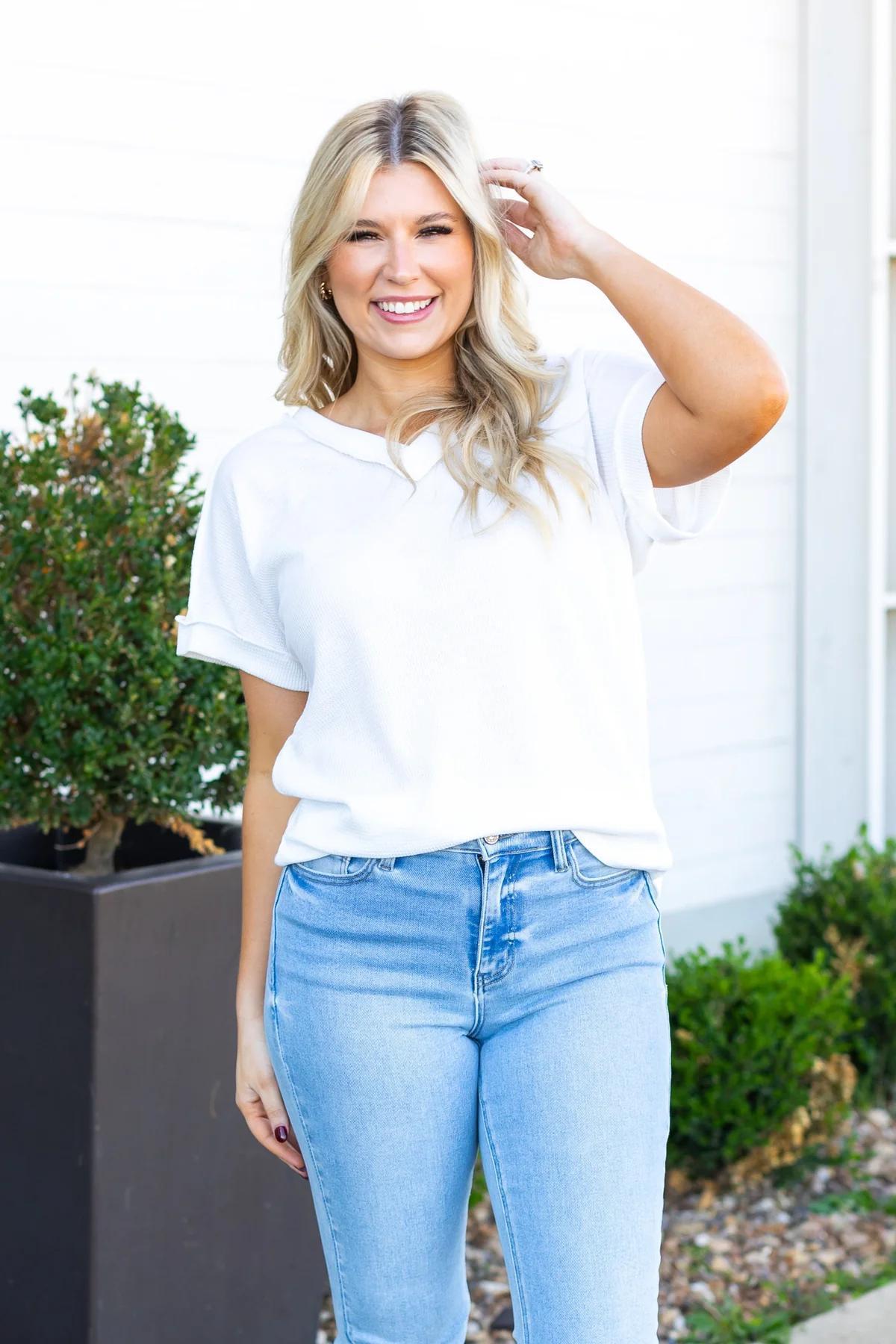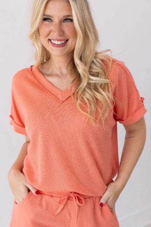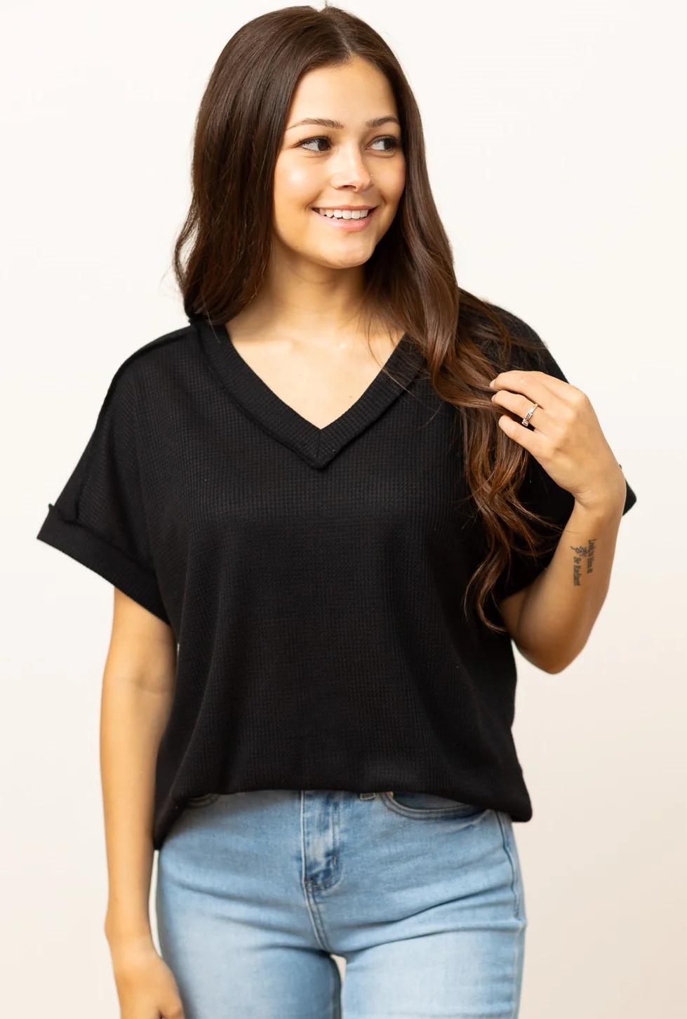 The Lucy Waffle Knit Top is a stylish and comfortable piece available in a variety of colors. Featuring a relaxed fit, this top is designed with a V-neck that adds a touch of sophistication. The unlined construction ensures a lightweight feel, while the waffle knit fabric provides some stretch for added comfort and flexibility.