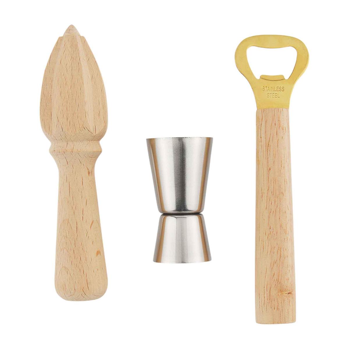 3-piece set: wooden juicer, stainless steel jigger and wood and brass finished bottle opener comes on kraft margarita recipe display card.