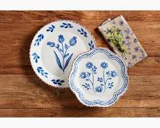 These stoneware platters feature a distinctive design with a hand-painted blue rim and a charming arrangement of flowers in the center. Available in two sizes, the small platter has a diameter of 11 inches, while the large platter boasts a diameter of 12.75 inches. The handcrafted nature of each piece adds a unique touch, making it an elegant and functional addition to any table setting or home decor. The combination of the hand-painted details and varying sizes provides versatility for serving and displaying culinary creations or decorative items.