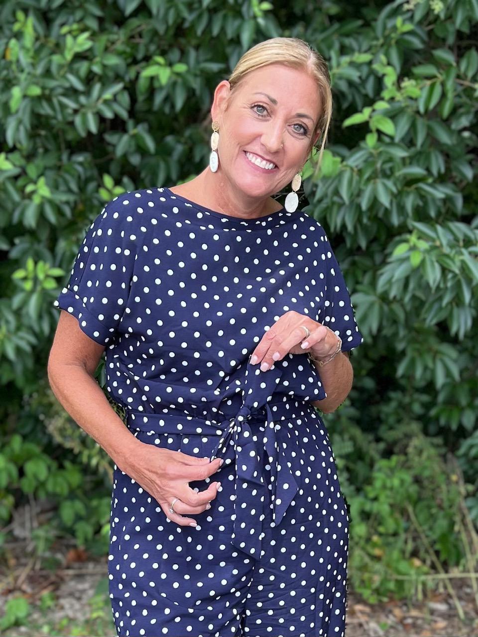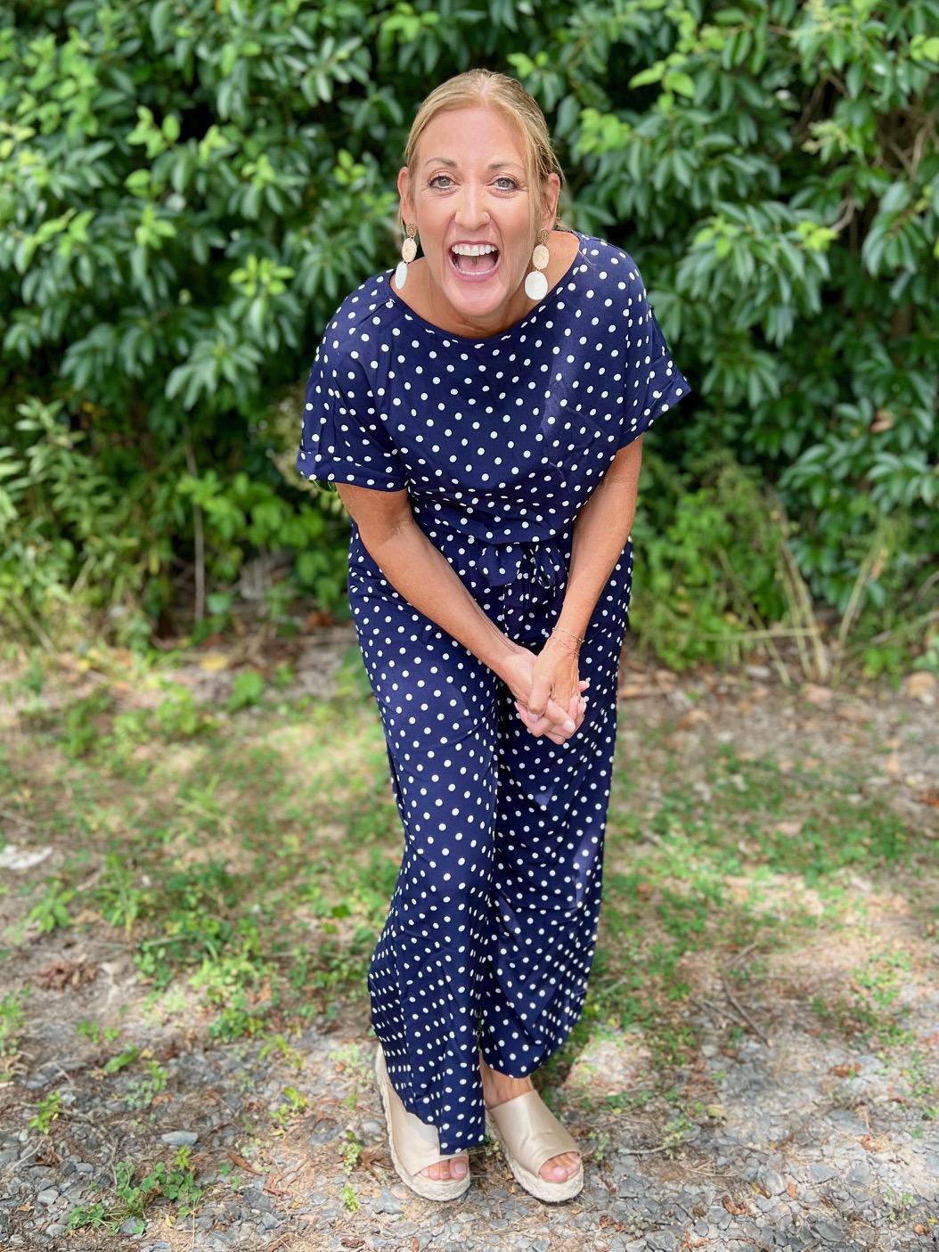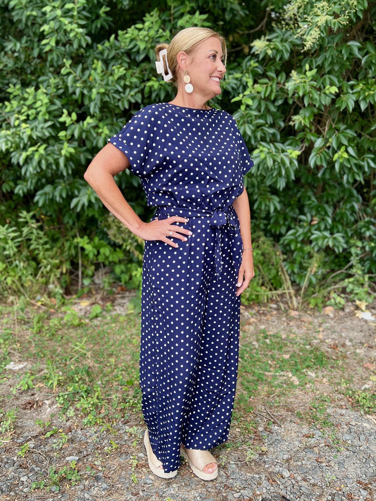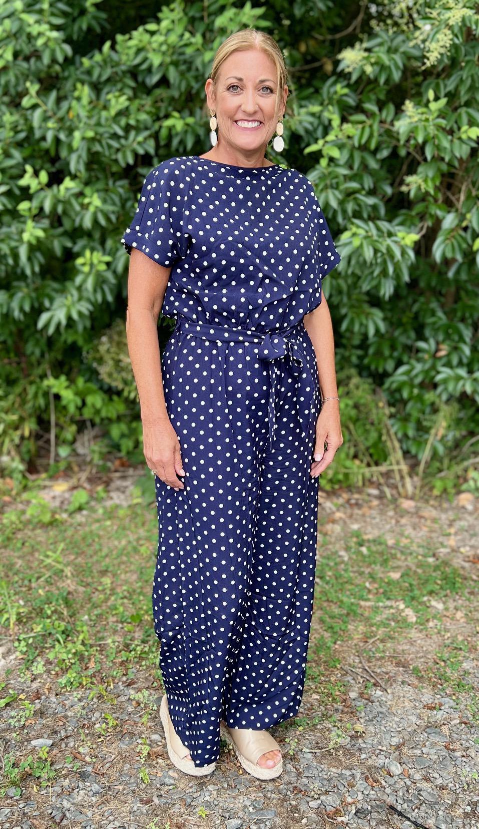 This navy blue jumpsuit features charming white polka dots and a flattering front tie detail. Its slightly wide-leg cut and lightweight fabric make it comfortable and versatile, perfect for dressing up or keeping casual. Easy to wear and style, it’s a reliable choice for any occasion.