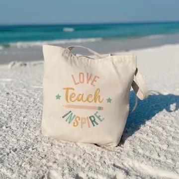 Love Teach Inspire Whether you're running errands, hitting the gym, or simply enjoying a day out, our Canvas Tote Bags are your trusty companion. Embrace the convenience of a spacious, eco-friendly, and stylish bag that's ready to accompany you on all your adventures.